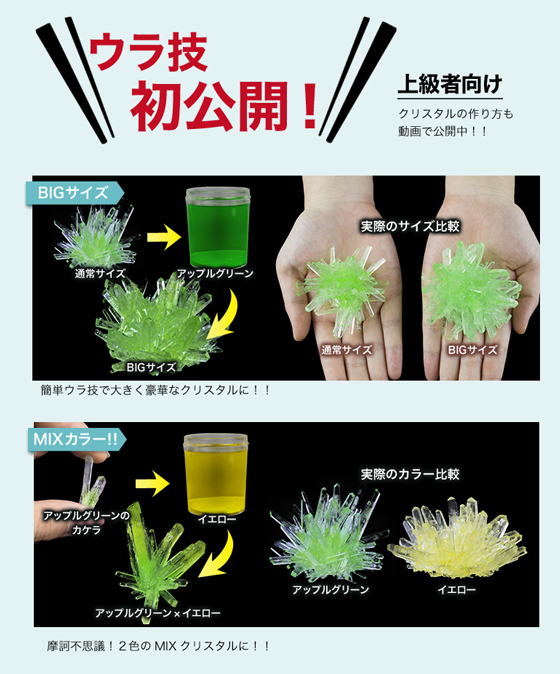 マジッククリスタルは毎回、違った形に育つところが一番の魅力!世界にたったひとつのオリジナルクリスタルが出来上がります。上級者になると、色をミックスしたり、完成したクリスタルでアクセサリーを作ったりと、マジッククリスタルを楽しめる幅がどんどん広がります!みなさんも是非マジッククリスタルで色々な可能性を楽しんでください♪